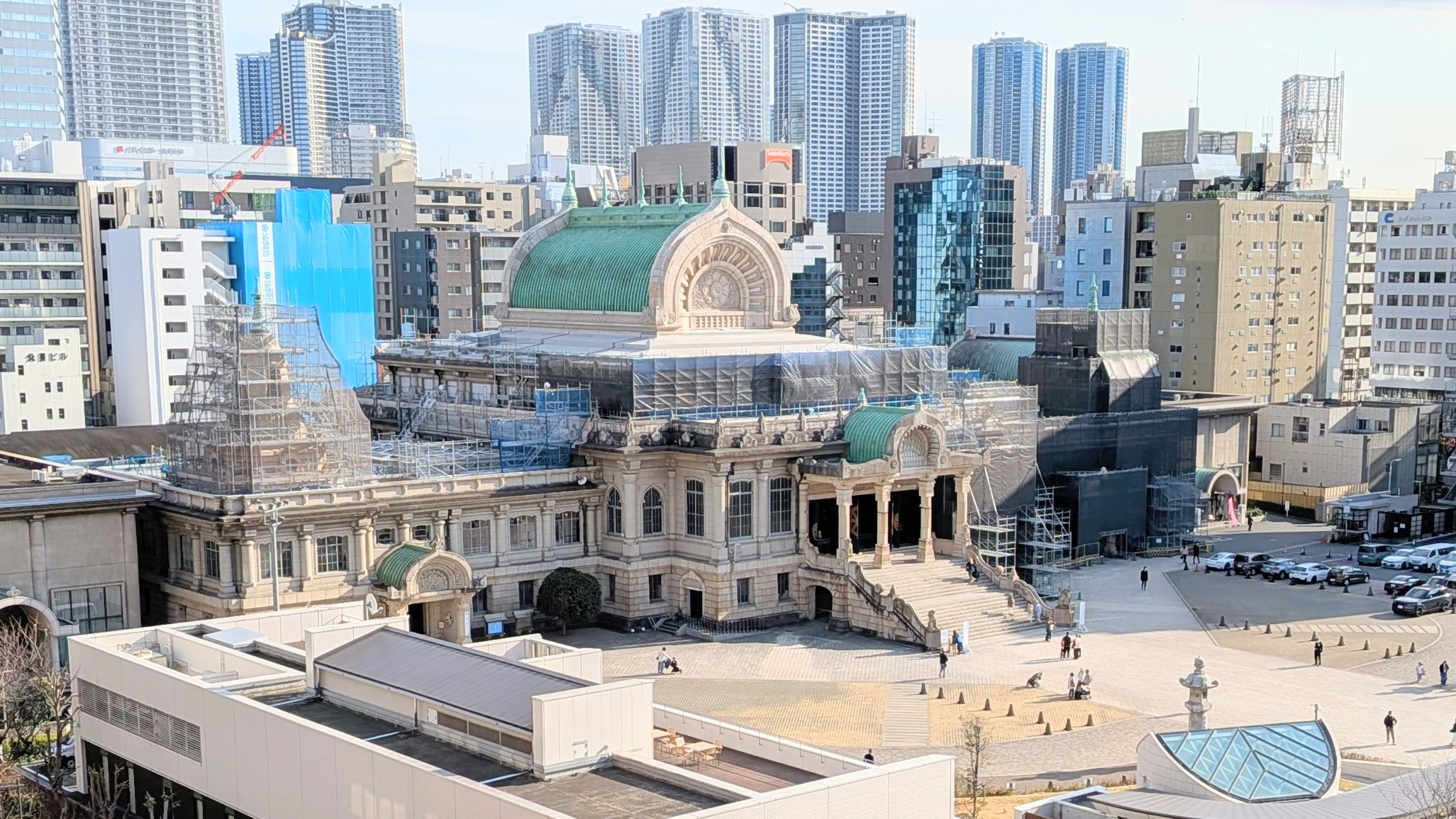 築地本願寺の景色を眺めながら、